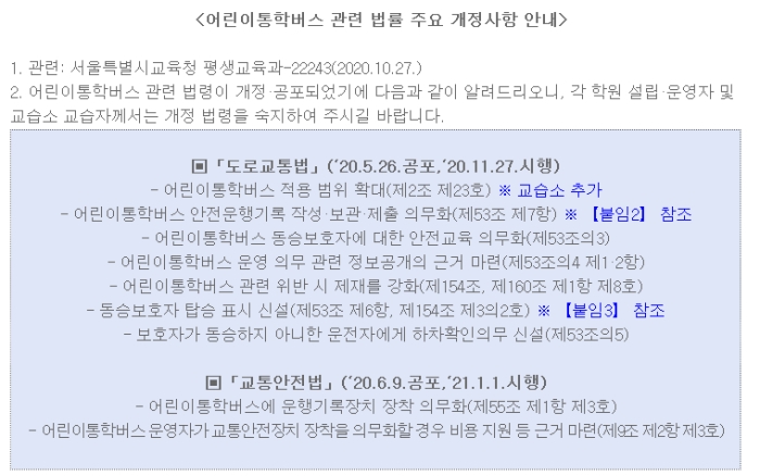어린이통학버스 관련 법령이 개정, 공포되었기에 다음과 같이 알려드리오니,